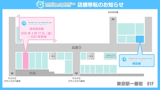 日頃よりhololive production official shopをご愛顧いただき、誠にありがとうございます。この度、2026年春までの期間限定営業を予定しておりました「Tokyo Station」および「Osaka Umeda」のショップにつきまして、皆様のご声援にお応えし、引き続き営業いたします。これに伴い、東京駅店は、4月17日(金)より新しい場所で期間限定で営業を継続いたします。その後、2026年秋以降に再度本営業を予定しています。